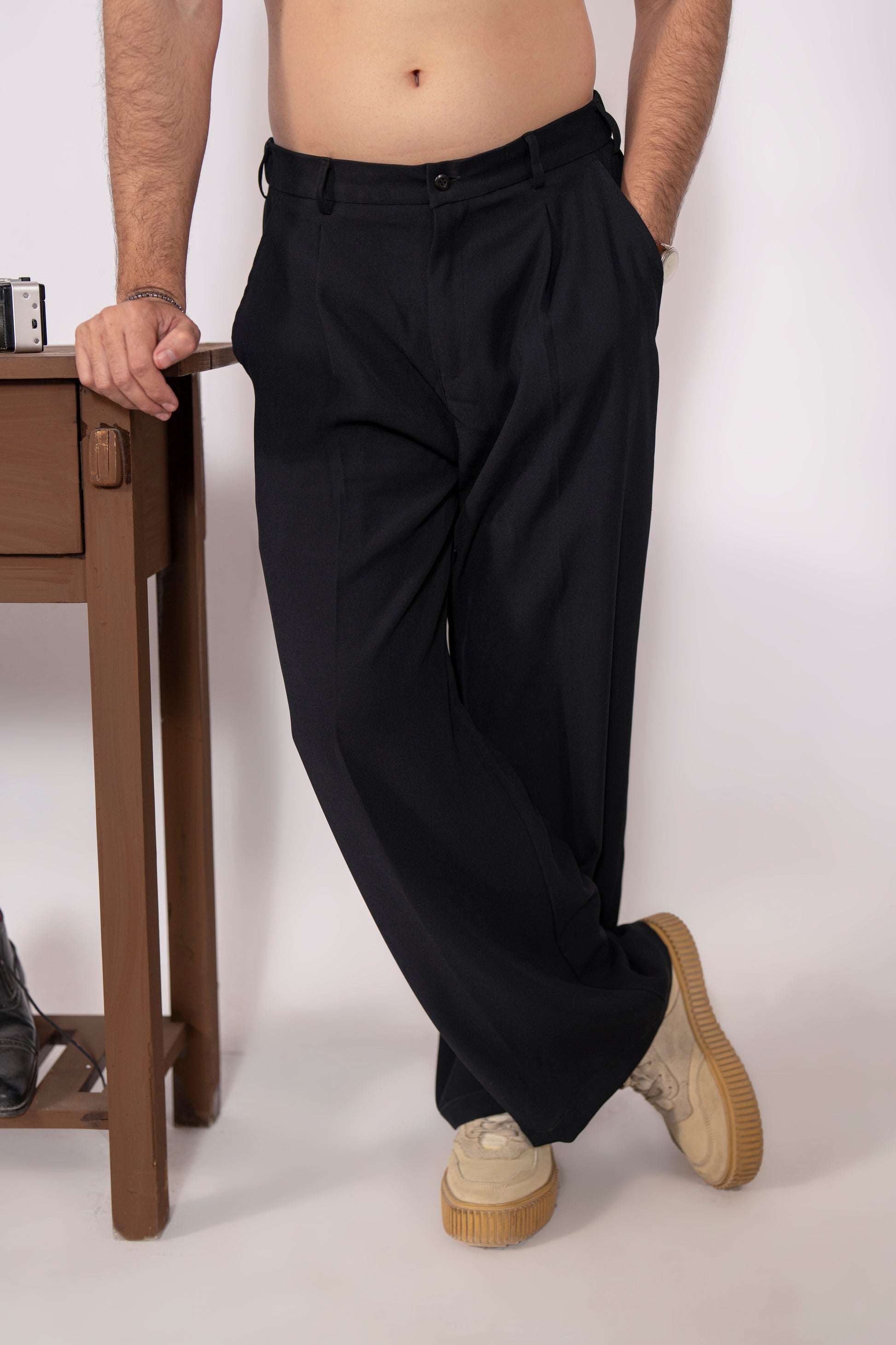 Front Pleat Detail: Featuring sophisticated front pleated detailing, secured with a top button and zip fly for a tailored look.