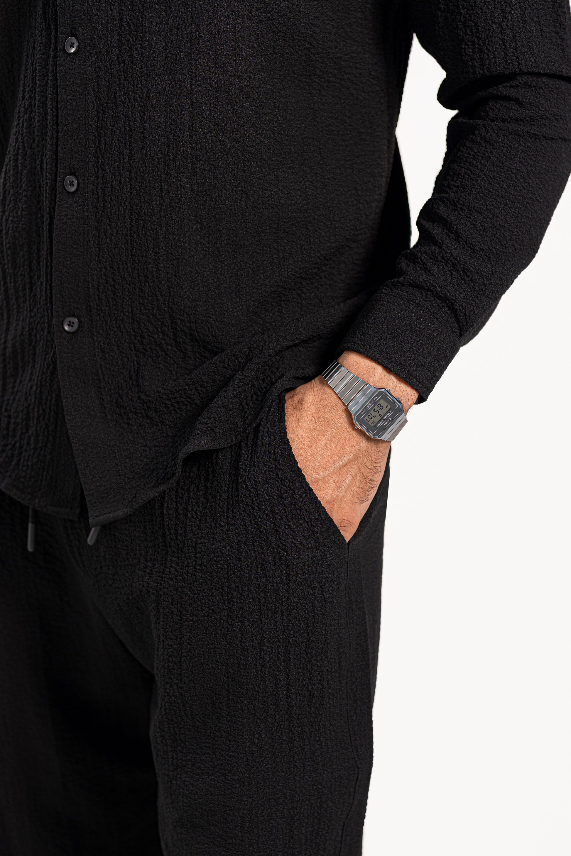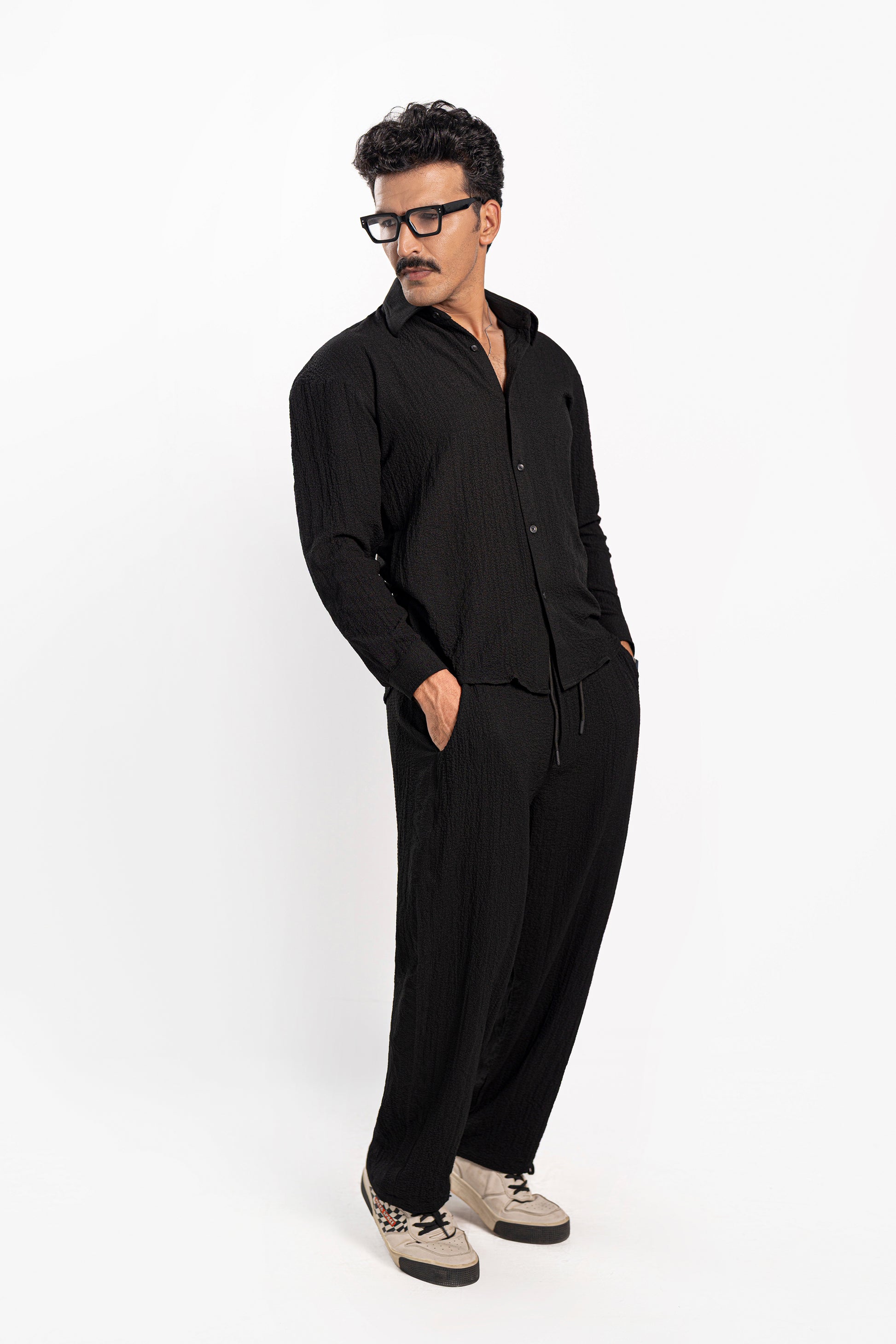 Features: This refined co-ord set combines effortless style with all-day comfort. The textured trousers, made from a Creased linen fabric, feature a wide-leg relaxed fit, and an adjustable elastic waist with drawstring for a tailored feel. Paired with an oversized Full Sleeves Point collar shirt, the set exudes timeless old-money elegance, perfect for making a sophisticated statement.