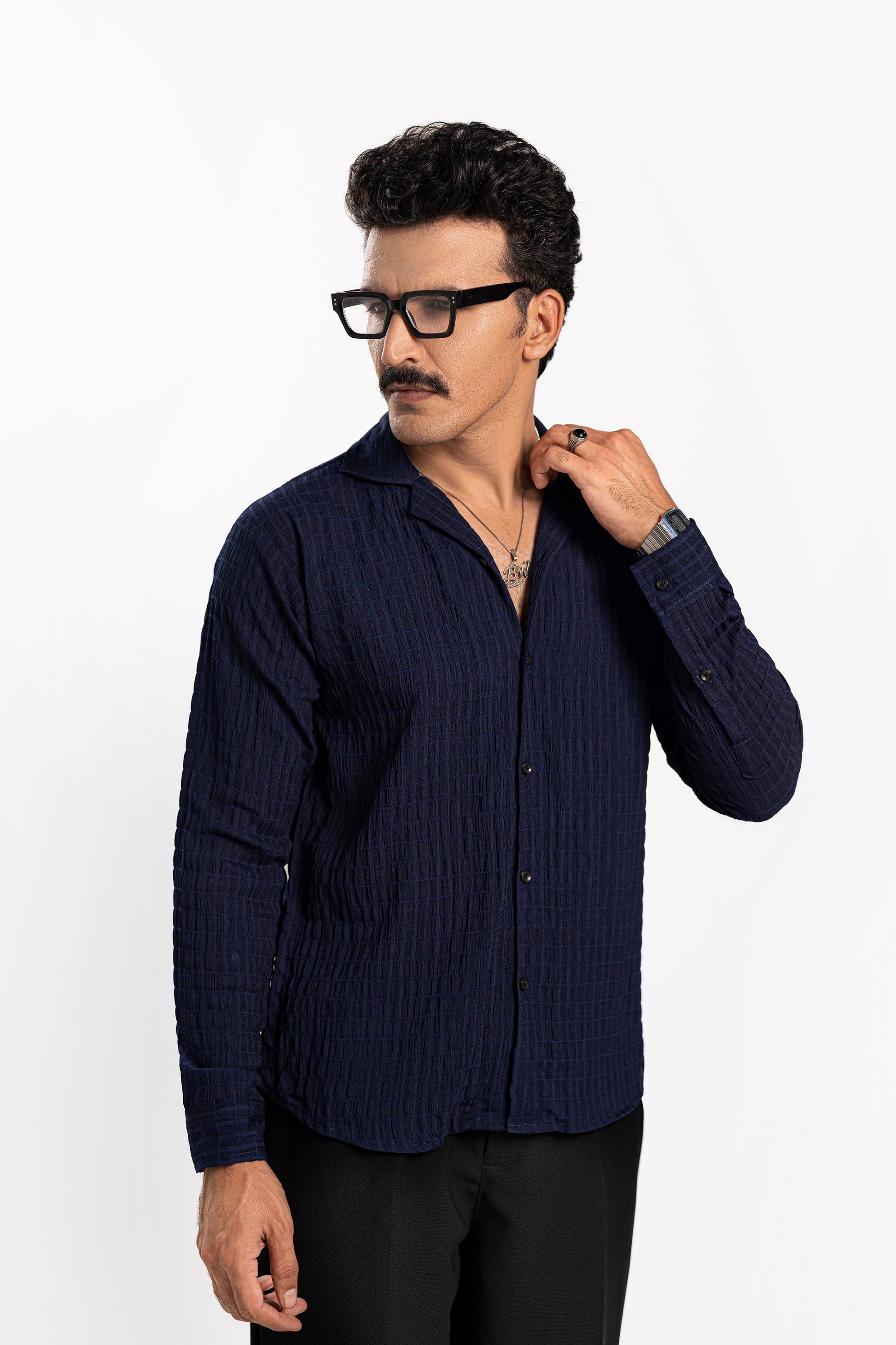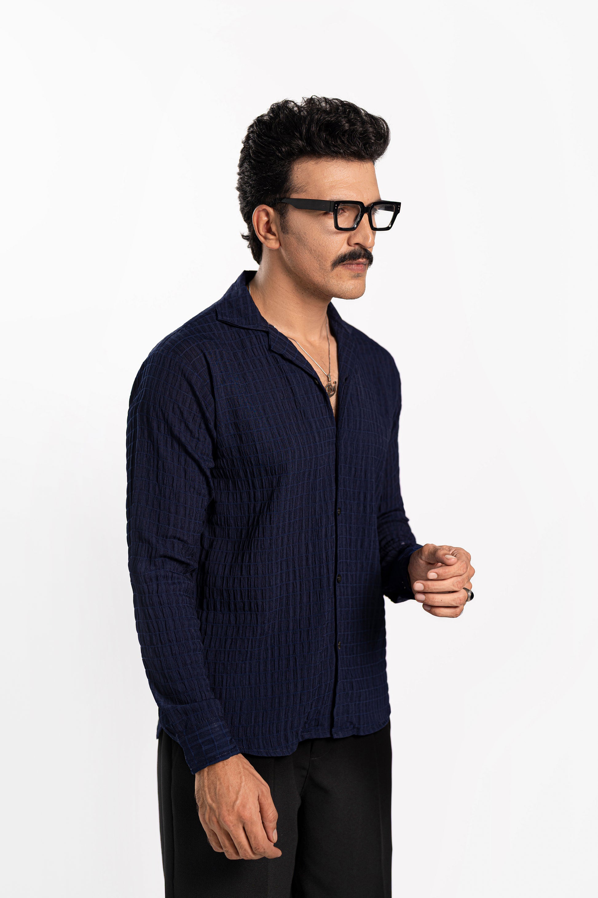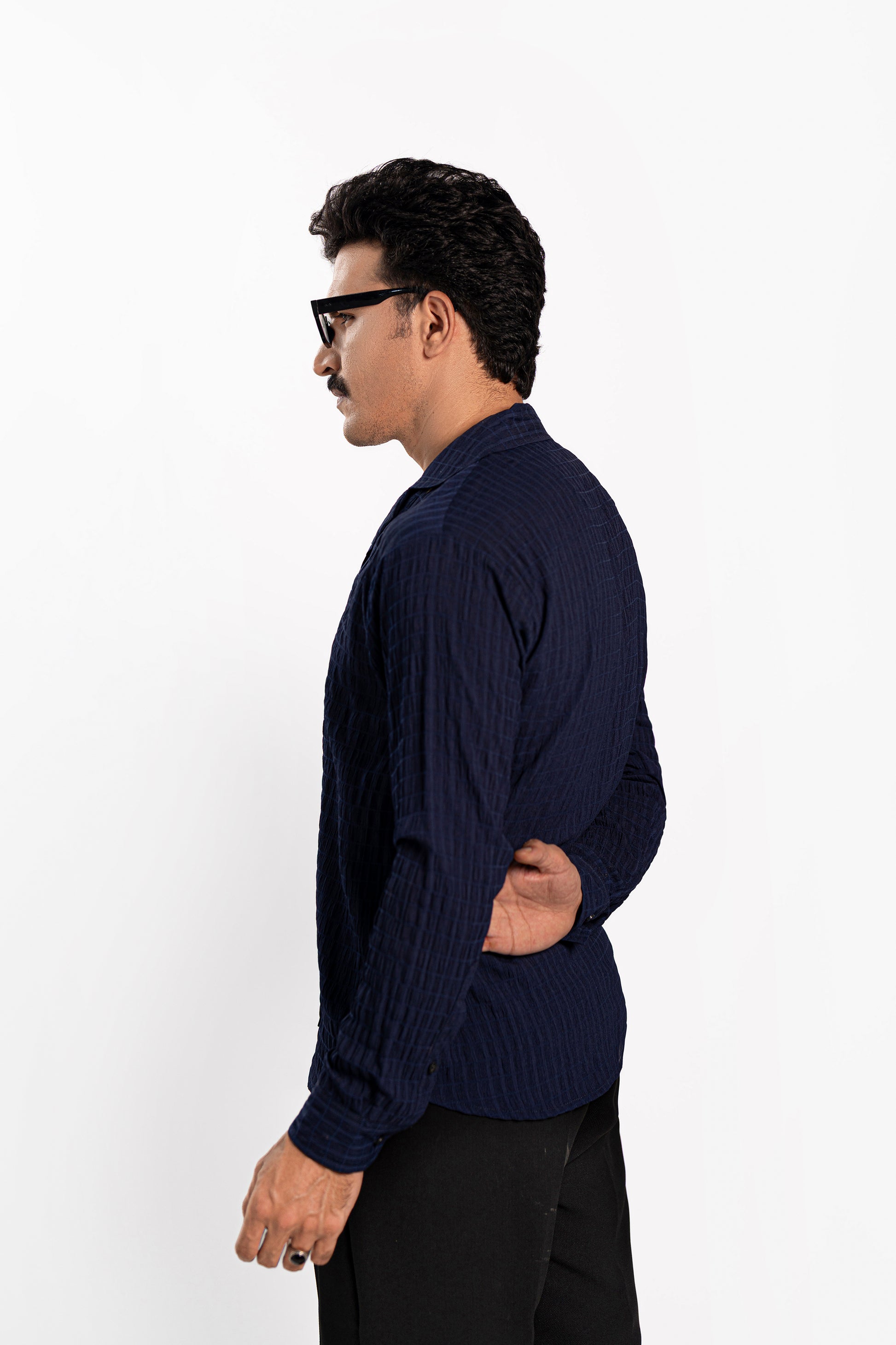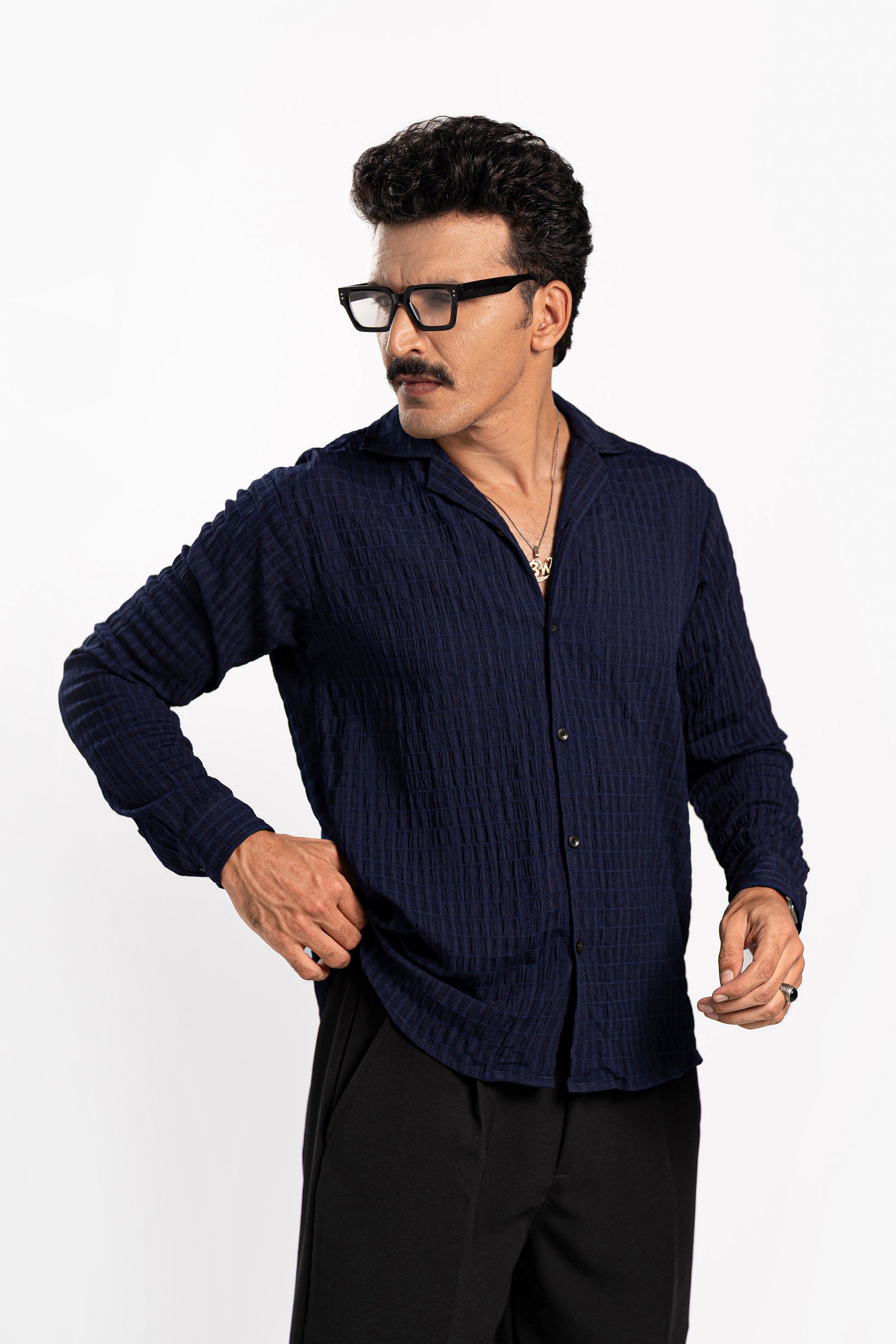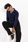 Cuban collar shirt with full sleeves, made from a textured fabric that feels incredibly comfy! Designed in a basic pattern with a rich navy color vibe, whether it’s the office, a date, or a casual outing with friends, this is your perfect old-money shirt. -