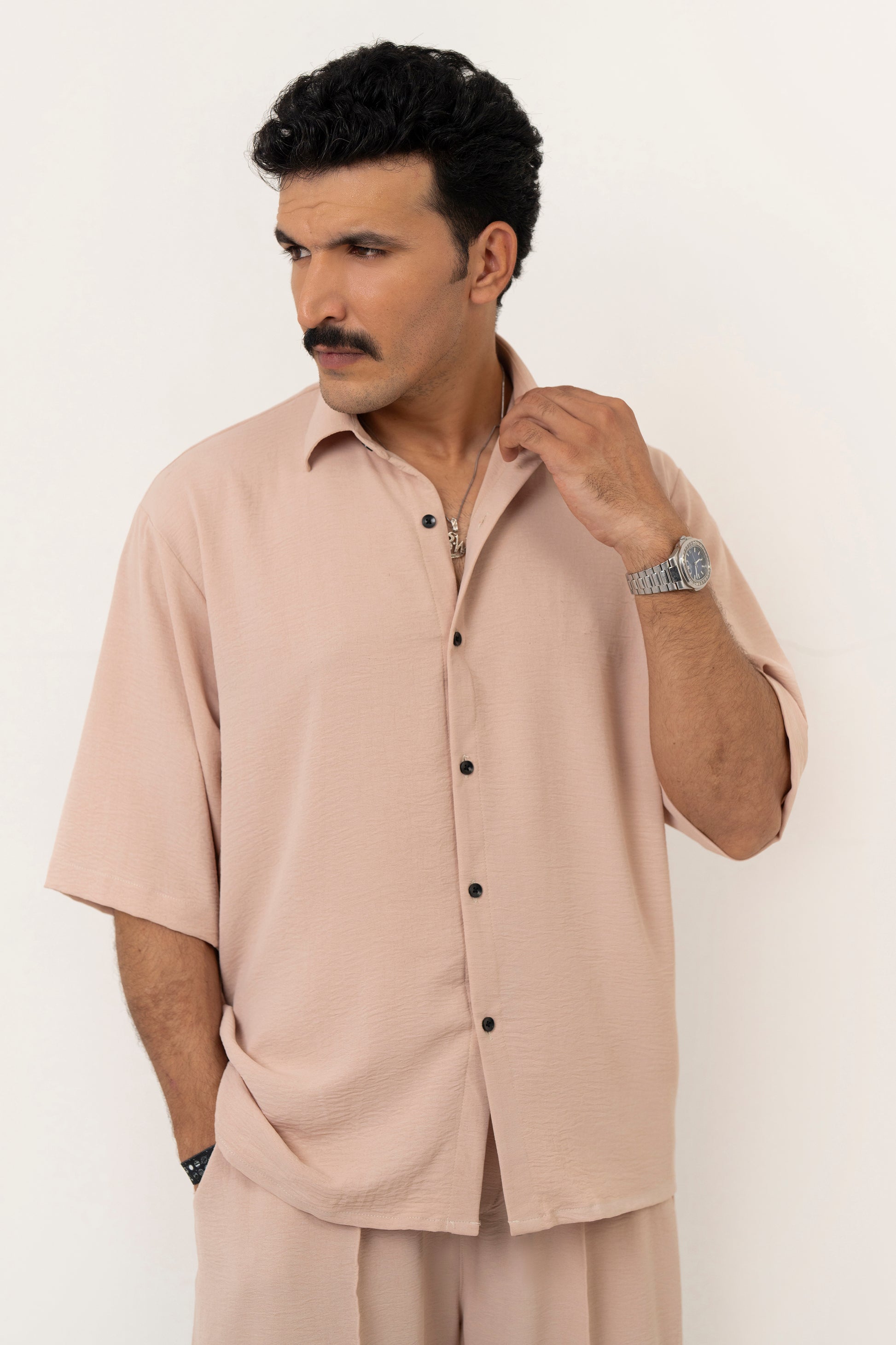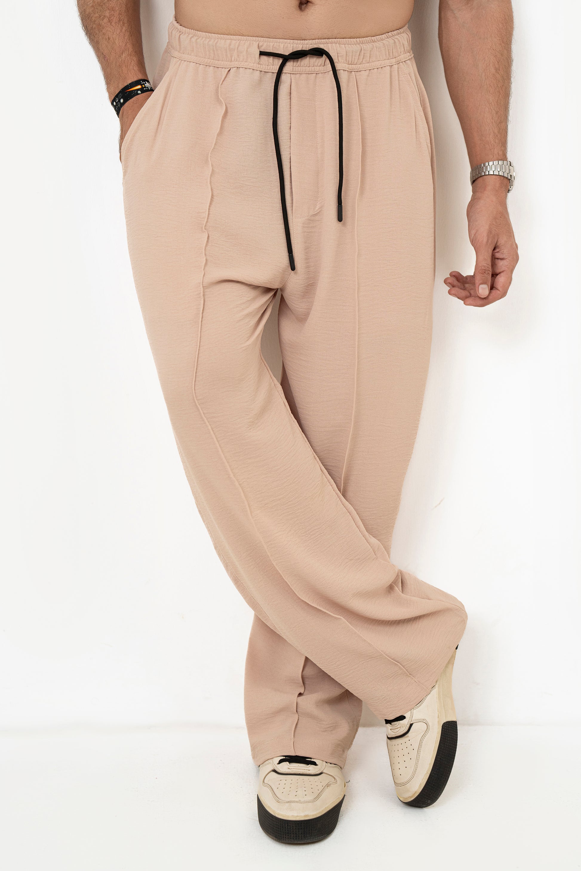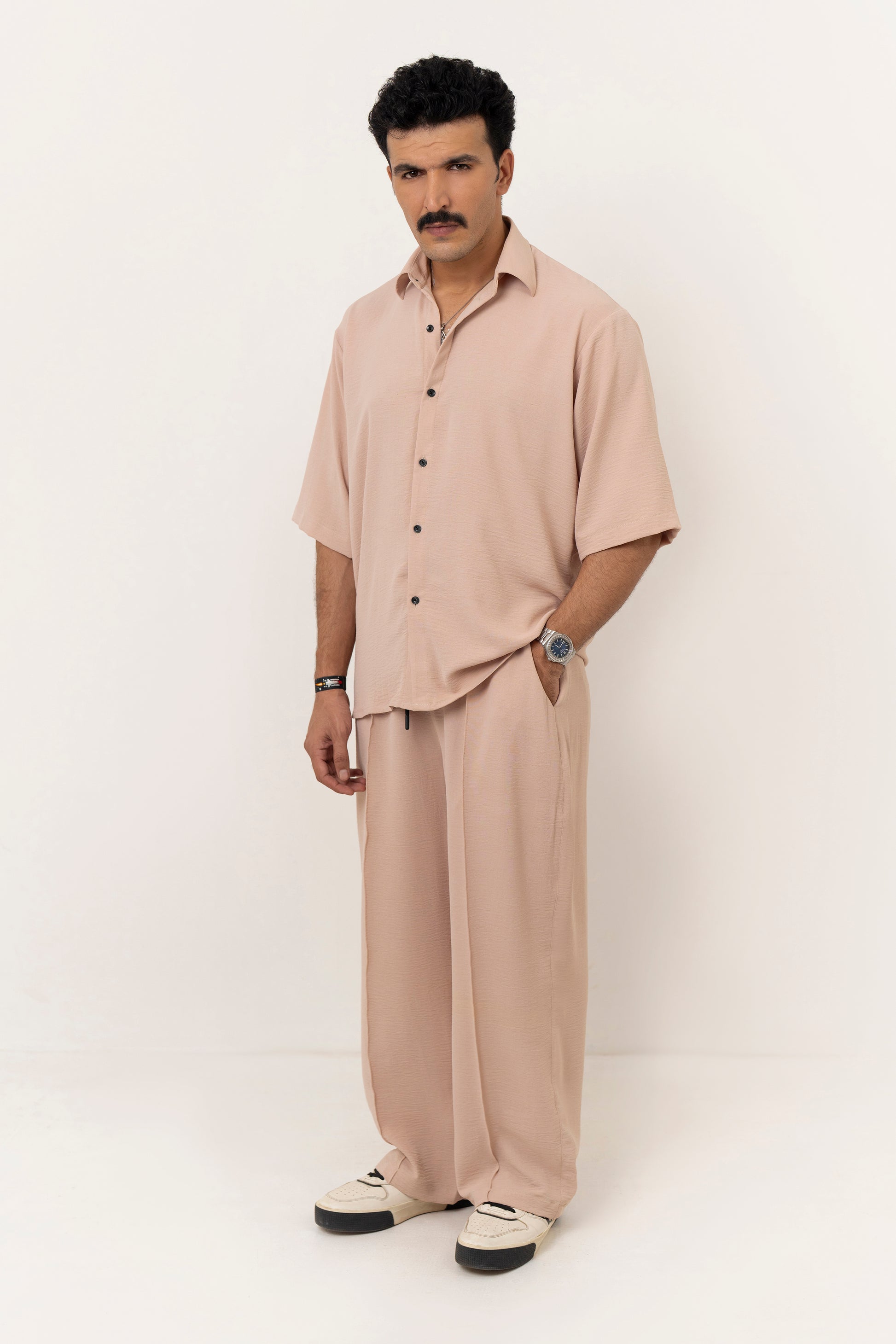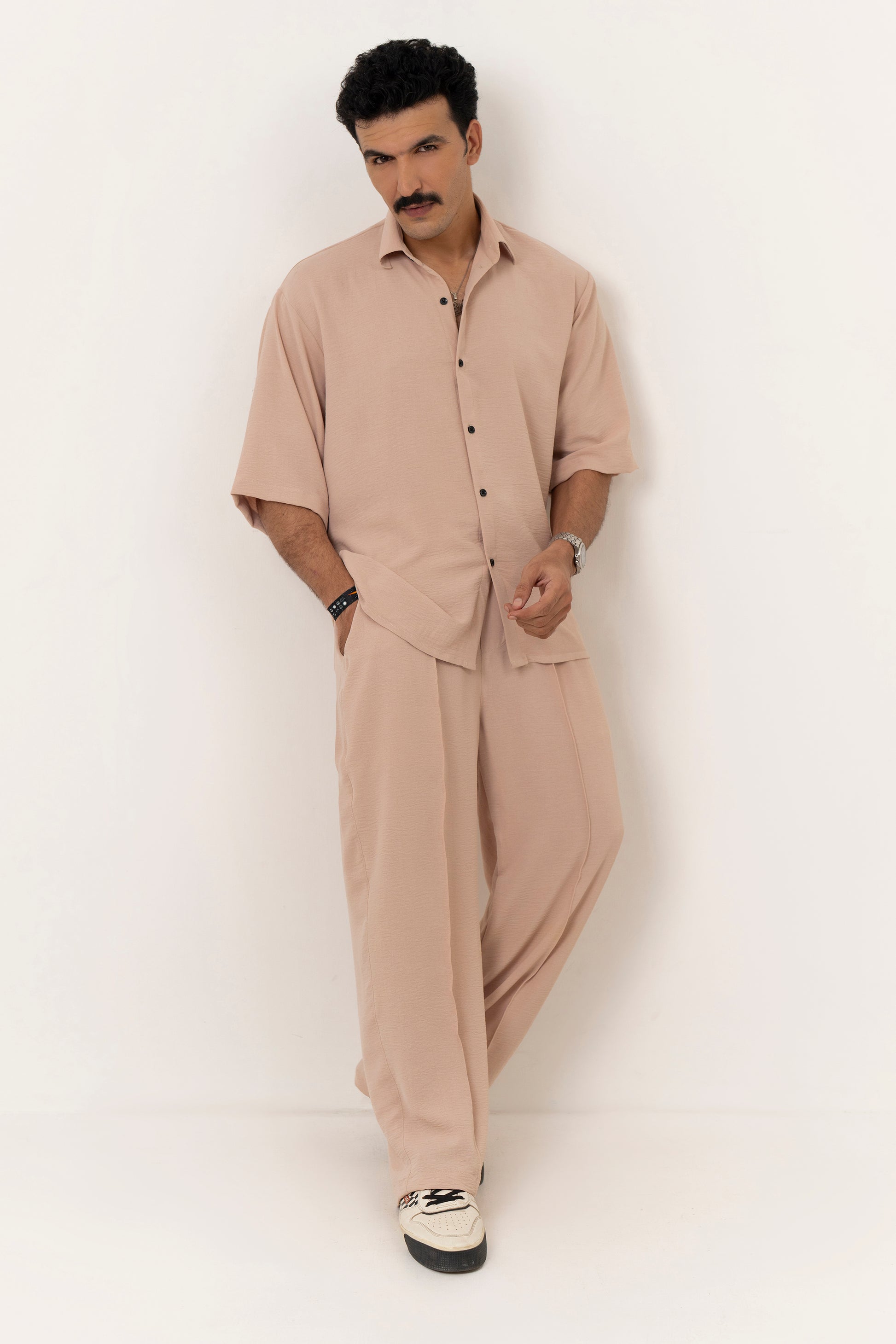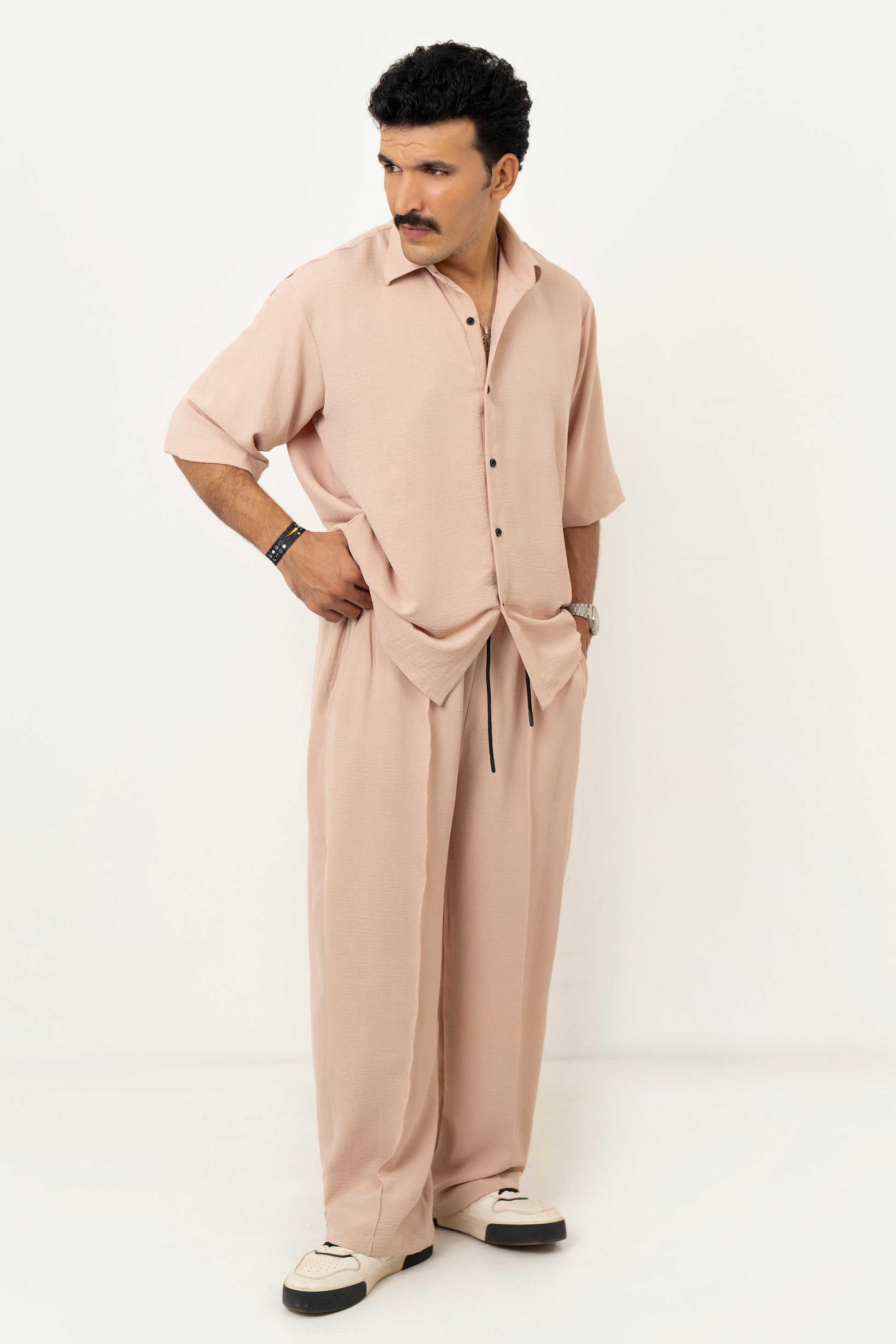 Features: This refined co-ord set blends modern style with effortless comfort. The textured, stretchable linen-cotton trousers feature refined front pintex detailing, a wide-leg relaxed fit, and an adjustable elastic waist with a drawstring for a personalized fit. They pair seamlessly with the oversized shirt, crafted with a boxy straight hem and a two-piece collar, [erfect for both casual outings and smart occasions.