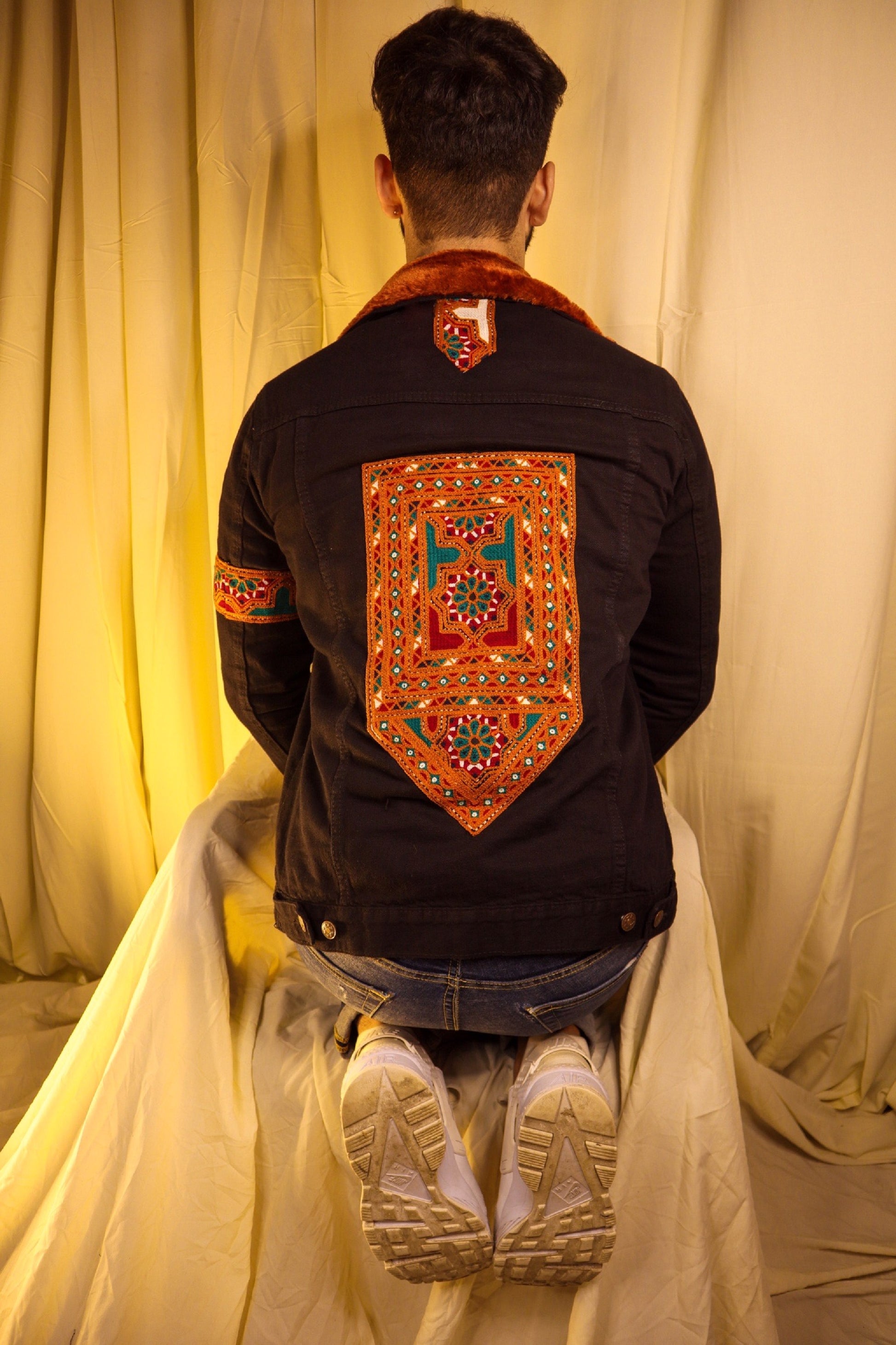 Features: This traditional denim jacket featuring a shirt collar and long sleeves with buttoned cuffs. Faux shearling collar. embroidered Balochi patch at the back and on the left sleeve. Two front flap pockets and two welt pockets. Front metal button fastening.